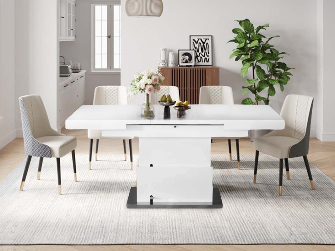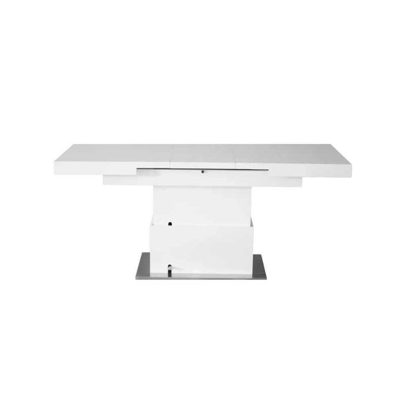 Cette table transformable conjugue polyvalence et design épuré. Son mécanisme de relevage et d'extension permet de passer de table basse (50cm) à table à manger (80cm de hauteur), tandis que sa longueur s'ajuste de 135 à 170cm selon vos besoins. Le plateau en MDF laqué blanc associé au pied central en inox garantit stabilité et facilité d'entretien. Capable d'accueillir jusqu'à 8 convives, elle s'adapte aux petits espaces tout en offrant une fonctionnalité remarquable. Un investissement intelligent pour les intérieurs modernes en quête de flexibilité.